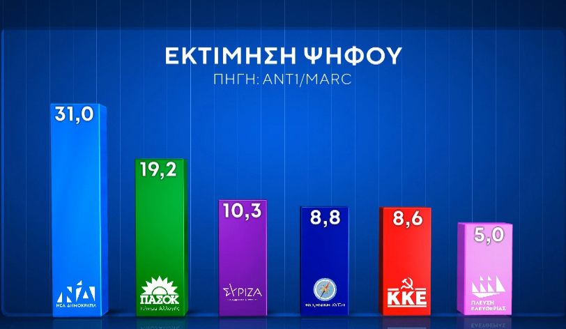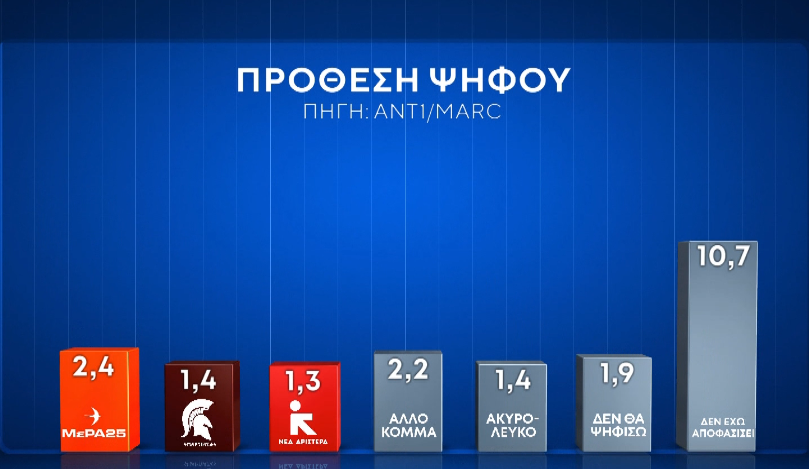 Τρίτο κόμμα είναι ο ΣΥΡΙΖΑ με 8,8%, μπροστά από την Ελληνική Λύση (7,5%) και το ΚΚΕ (7,4%) στο 4,2% είναι η Πλεύση Ελευθερίας, το 4% συγκεντρώνει η Φωνή Λογικής και το 2,7% η Νίκη, ενώ το 10,7% δηλώνουν αναποφάσιστοι.