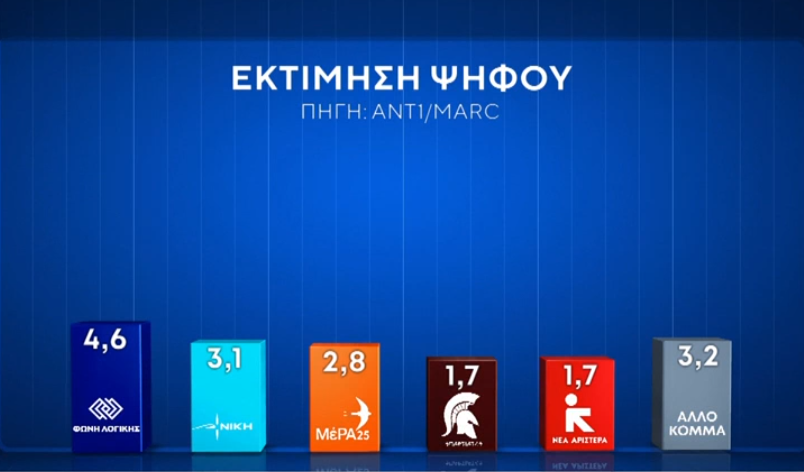 Στην τέταρτη θέση βρίσκεται η Ελληνική Λύση (8,8%), με μικρή διαφορά από το ΚΚΕ (8,6%), ενώ ακολουθούν η Πλεύση Ελευθερίας (5%), η Φωνή Λογικής (4,6%) και η Νίκη (3,1%).