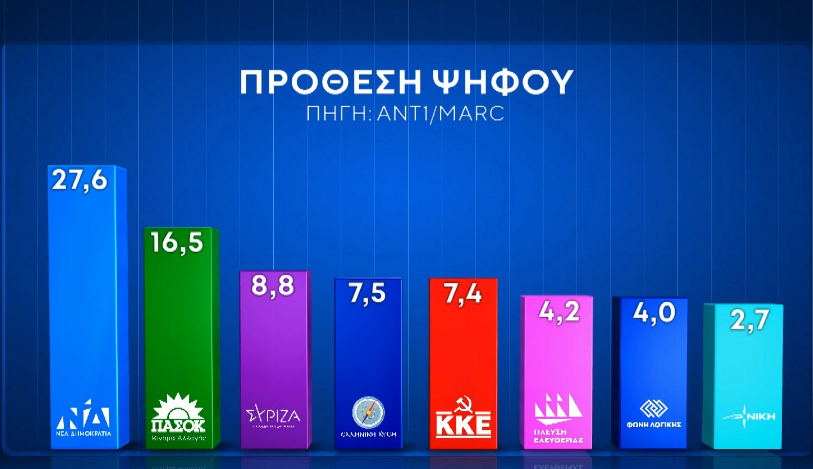 Στην πρόθεση ψήφου, η Νέα Δημοκρατία συγκεντρώνει το 27,6% και έχει προβάδισμα 11,1 μονάδων έναντι του ΠΑΣΟΚ που βρίσκεται στη δεύτερη θέση (16,5%).