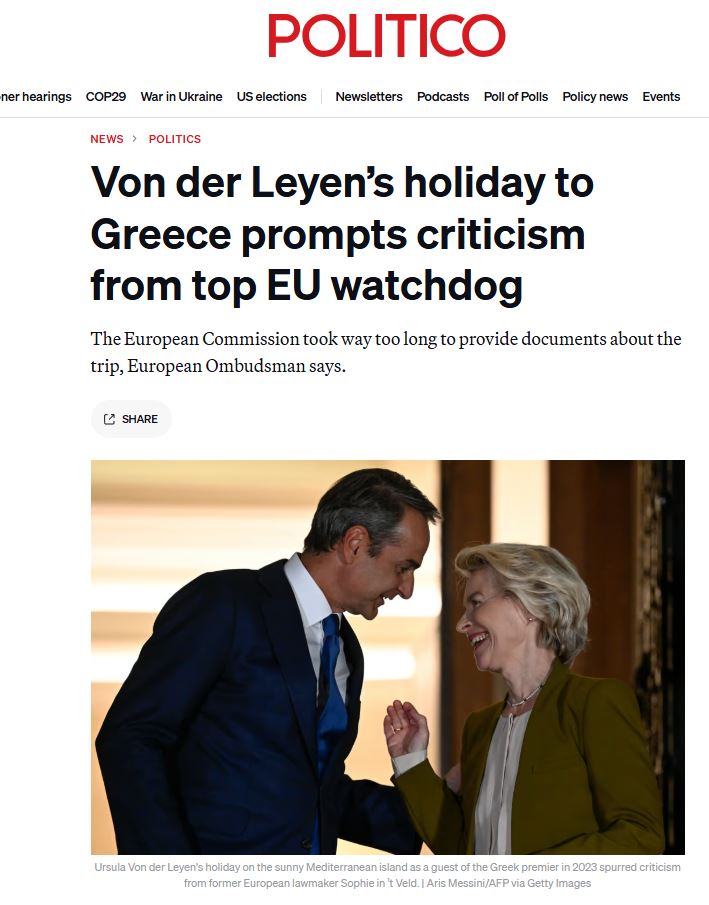 Ειδικότερα, σύμφωνα με το Politico, η Ευρωπαία Διαμεσολαβήτρια επέκρινε σφοδρά την Πρόεδρο της Ευρωπαϊκής Επιτροπής για τις δωρεάν καλοκαιρινές διακοπές της στο σπίτι του Έλληνα Πρωθυπουργού Κυριάκου Μητσοτάκη στην Κρήτη.