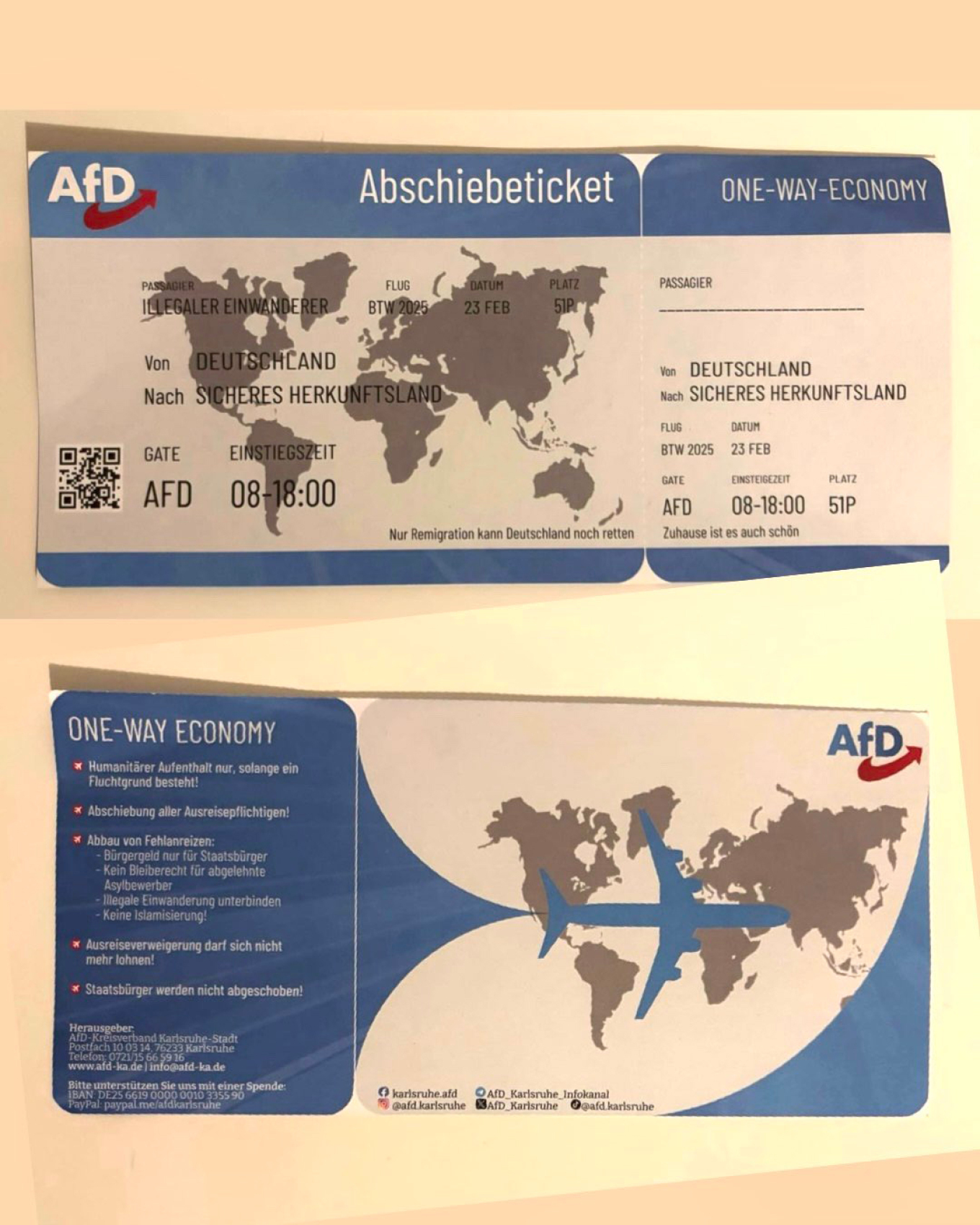 Οι εικόνες με τα φυλλάδια – εισιτήρια κάνουν τον γύρο του διαδικτύου και των μέσων κοινωνικής δικτύωσης ενώ το τοπικό γραφείο του AfD στην Καρλσρούη αναφέρει πως τα φυλλάδια δεν είναι πραγματικά εισιτήρια. .