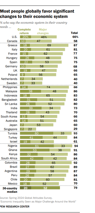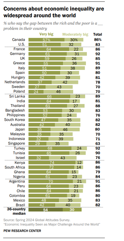 Σε γενικές γραμμές τα ποσοστά όσων θεωρούν την οικονομική ανισότητα πολύ μεγάλο πρόβλημα είναι υψηλότερα στις χώρες με μεσαία και χαμηλά εισοδήματα, σε σχέση με τις χώρες με υψηλά εισοδήματα.