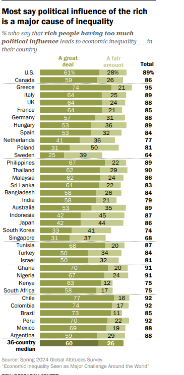 Το ποσοστό όσων θεωρούν την πολιτική επιρροή των πλουσίων ως πολύ μεγάλο παράγοντα ανισότητας, ανέρχεται στην Ελλάδα στο 74% – το τρίτο υψηλότερο ποσοστό μετά τη Χιλή και την Κολομβία.
