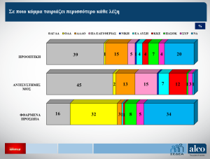 Στο πεδίο των ποιοτικών χαρακτηριστικών, τα δεδομένα είναι εξίσου αποκαλυπτικά. Η έννοια της «σταθερότητας» εξακολουθεί να συνδέεται σε σημαντικό βαθμό με τη ΝΔ, όμως μόνον το 64,5% των πρώην ψηφοφόρων της διατηρεί αυτή τη σύνδεση. Η φθορά είναι εμφανής. Ακόμη πιο βαρύ είναι το εύρημα γύρω από τη λέξη «διαφθορά»: το 52% του συνόλου των πολιτών τη συσχετίζει με τη ΝΔ, ενώ στην ηλικιακή ομάδα 25–44 το ποσοστό εκτινάσσεται στο 63%. Το γεγονός ότι το 25% των πρώην ψηφοφόρων της ΝΔ συνδέει επίσης τη «διαφθορά» με το ίδιο το κόμμα, υποδηλώνει διάβρωση της ηθικής αξιοπιστίας του.