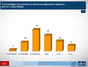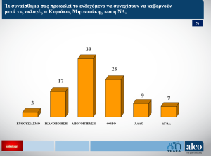Εντυοωσιακό είναι επίσης το ποσοστό των πολιτών που απαντούν σε ένα ποσοστό 64% οι οτι αισθάνονται απογοήτευση ή φόβο στην περίπτωση που μετά τις εκλογές συνεχίζει να κυβερνάει ο κ. Μητσοτάκης και η ΝΔ.